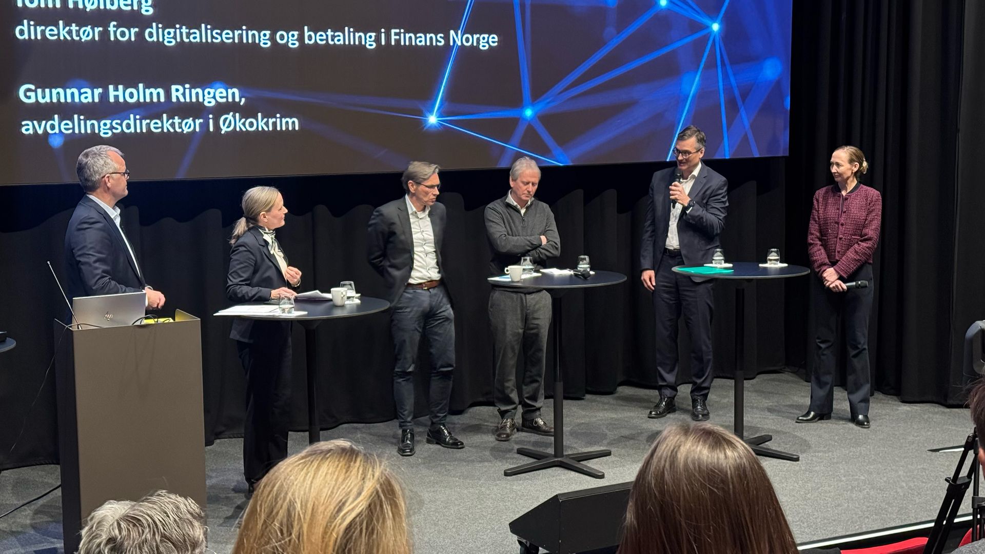 Sandkassedebatt med (f.v.) Knut Haugan, Finanstilsynet, Line Coll, Datatilsynet, Gunnar Holm Ringen, Økokrim, Tom Høiberg, Finans Norge, Fredrik Berger, DNB og Marte Kopperstad i Nordea. Foto: Jörgen Skjelsbæk.